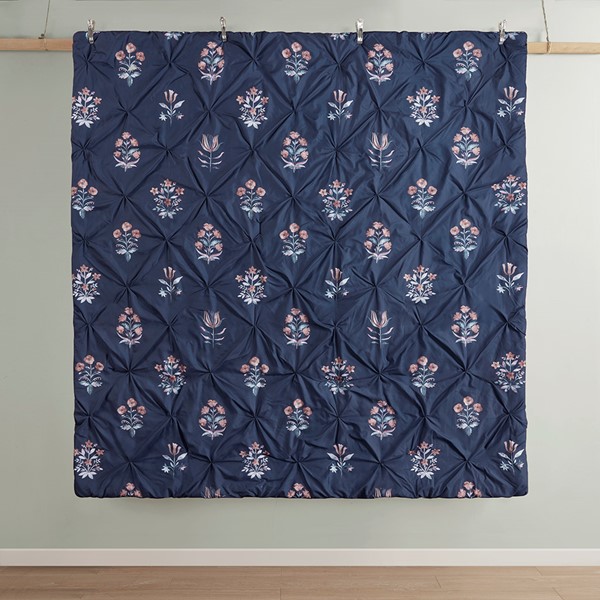 Featuring a floral print on a navy ground with pintuck technique, this microfiber duvet cover set exudes a modern farmhouse style that adds a touch of elegence to any bedroom. Also included are two matching shams to complete the set. Colors featured in the floral motifs include shades of peach, blush, red, teal, and white. The duvet cover come with button closures and 4 inner ties to help keep your duvet insert secured (inserts sold separately).