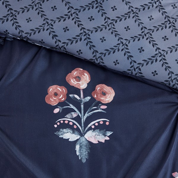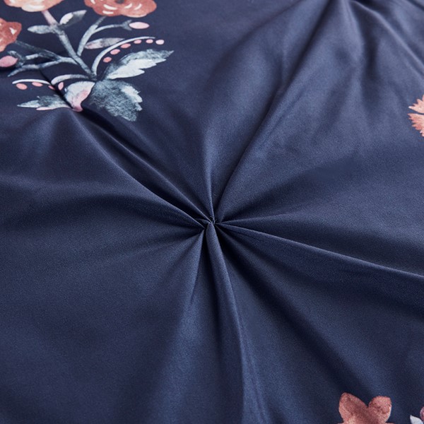 Featuring a floral print on a navy ground with pintuck technique, this microfiber duvet cover set exudes a modern farmhouse style that adds a touch of elegence to any bedroom. Also included are two matching shams to complete the set. Colors featured in the floral motifs include shades of peach, blush, red, teal, and white. The duvet cover come with button closures and 4 inner ties to help keep your duvet insert secured (inserts sold separately).