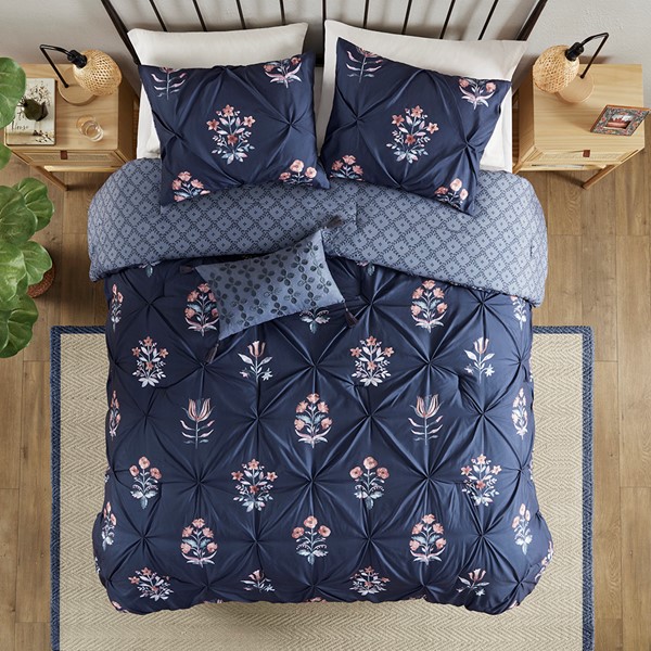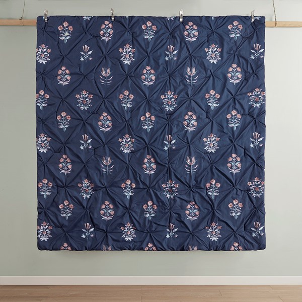 Featuring a floral print on a navy ground with pintuck technique, this microfiber comforter set exudes a modern farmhouse style that adds a touch of elegence to any bedroom. The decorative throw pillow feature gorgeous embroidery and corner tassels that complements the bedding, adding to the overall charm of the set. Colors featured in the floral motifs include shades of peach, blush, red, teal, and white. The comforter and pillows are filled with hypoallergenic polyester filling that is treated to be dustproof, ensuring a restful and comfortable sleeping experience.