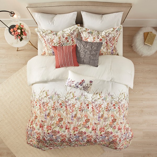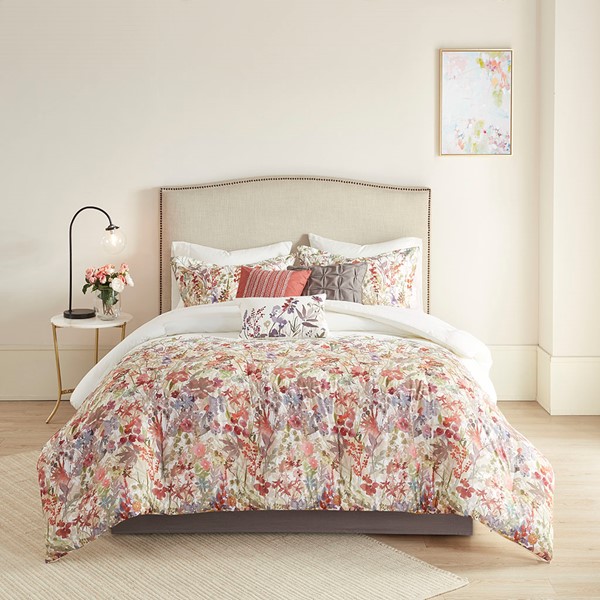 The Madison Park Mariana 7 Piece Cotton Printed Comforter Set brings a touch of beauty to your bedroom decor. This cotton comforter features a watercolor floral print that runs from the middle of the bed to the foot, for a beautiful transitional look. Two coordinating shams pair perfectly with the comforter, while three decorative pillows with embroidery and tufted details provide rich textural accents to the bed. A solid bed skirt adds the finishing touch to complete the cotton comforter set. Machine washable for easy care, this bedding set is also OEKO-TEX certified, meaning it does not contain any harmful substances or chemicals to ensure quality comfort and wellness. Items in the set may come in a rolled or compressed packaging, which will need to be fluffed up or steam ironed before use to remove wrinkles.