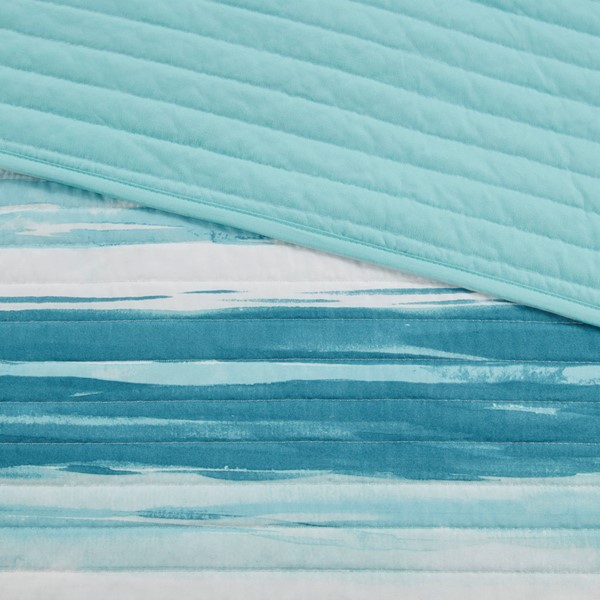The Madison Park Marina 6 Piece Reversible Quilt Set provides a modern take on the coastal stripe. It’s watercolor motif, accented with shades of storm blue, aqua, teal and pastel blue, provides the calming feel of the ocean in your space. Three decorative pillows use embroidered seashells and fabric manipulation to pull this look together.