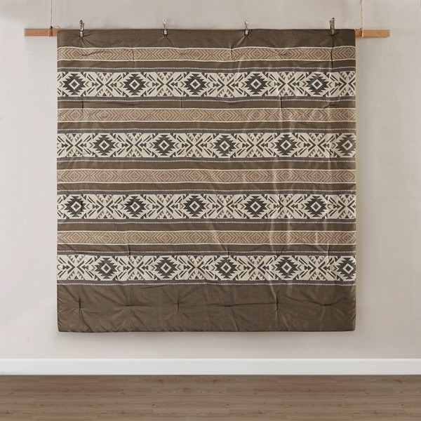 Spice up the bedroom with this southwestern-insprired comforter set featuring stipes with bold geometric patterns in hues of brown, tan, grey, and black. The design is printed on soft herringbone polyester enhancing the lodge aesthetics. The two throw pillows are embellished with embroidery, piecing and top stitching techniques. The comforter and pillows are filled with hypoallergenic polyester filling that is dustproof, ensuring a restful and comfortable sleeping experience.