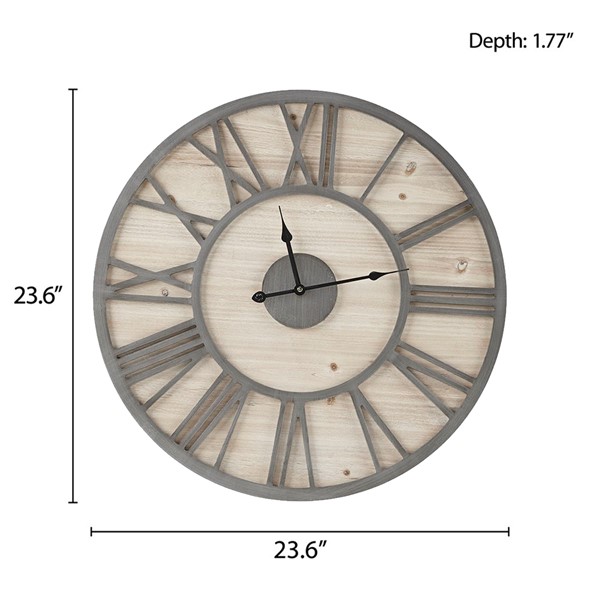 The Madison Park Mason 23.6″ Wood Wall Clock offers a contemporary rustic charm to your home decor. This round clock features a grey metal frame with Roman numeral on a natural wood grain MDF, creating charming farmhouse look. A hanger hook on the reverse makes the clock easy to hang in any room. Measuring 23.6-inches, this large wall clock has quartz movement and brings a modern update to your decor. 1 AA battery (sold separately) is needed. Due to nature of real fir wood surface, product face will vary with some discoloration and wood knots (dot-like markings) unique to each piece.