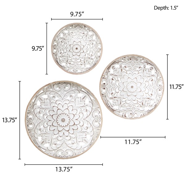 Update any room in your home with our Madison Park Medallion Trio Distressed White Floral 3-piece Carved Wood Wall Decor Set. Each round piece features a 100% fir wood frame with an intricate white wood medallion design in the center, for a vintage and globally inspired look. A Sawtooth hanging fixture on the back makes each wall art piece easy to hang. With so many options – arrange this 3 piece wall decor set any way you desire to suit any small size space and add that perfect charming touch!
