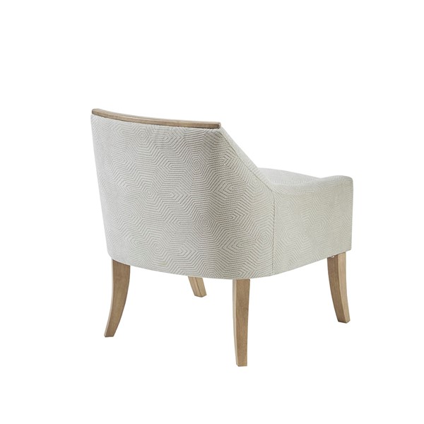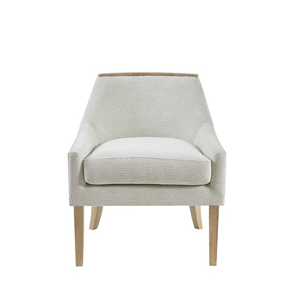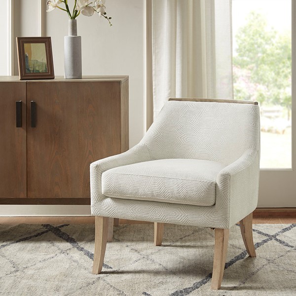 Complete your home decor with the chic style of the Madison Park MiaRose Accent Chair. This accent chair is upholstered in a geometric jacquard fabric that creates a stunning transitional look with a soft hand-feel. The low back and recessed arms provide an elegant silhouette, while the exposed wood at the top complements the design. Solid wood legs match the exposed wood on the back and provide a sturdy base. Add this accent chair to your living room decor and elevate the look of your space. Leg assembly required and tools are included.