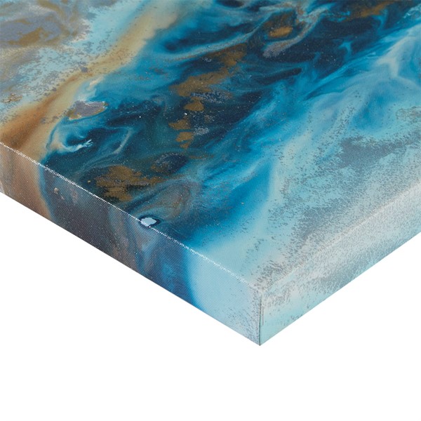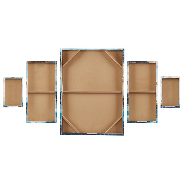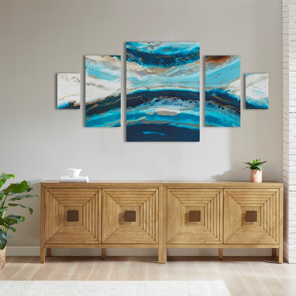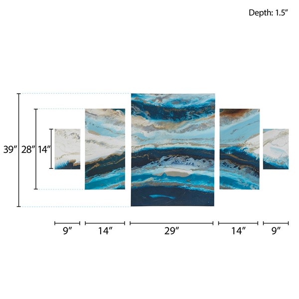 Give your home a beautiful modern touch with the Madison Park Midnight Tide Blue Abstract 5-piece Canvas Wall Art Set by Artist Blakely Bering. Showcasing cool blues and earthy tones, this oversized five piece wall art set creates a gorgeous abstract image that can serve as the focal point in any room. The contrasting colors are protected by a gel coating that provides additional texture and a glossy finish, while also preventing fading over time. A cardboard backing on each canvas adds structure and support, while two D-rings on the reverse of each piece makes this set easy to hang. Comes as a 5 Piece set in varying sizes; Display this gel coat canvas set together for an oversized art piece sure to capture anyone’s attention, or hang pieces separately throughout your home to fit any smaller space. Spot clean only.