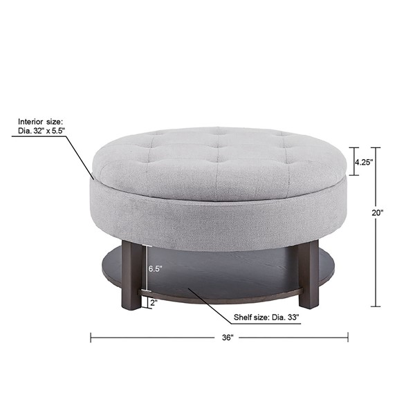 Don’t sacrifice style for storage with the Madison Park Miller Round Storage Ottoman. The round storage ottoman features a Light Grey upholstered tufted top that opens to reveal ample storage space. A lower veneer shelf provides storage for magazines and newspapers. Incorporate this round ottoman to your home to centralize the clutter and add a stylish touch to your living room. Removable cushion, not reversible. Leg assembly required, tools included.