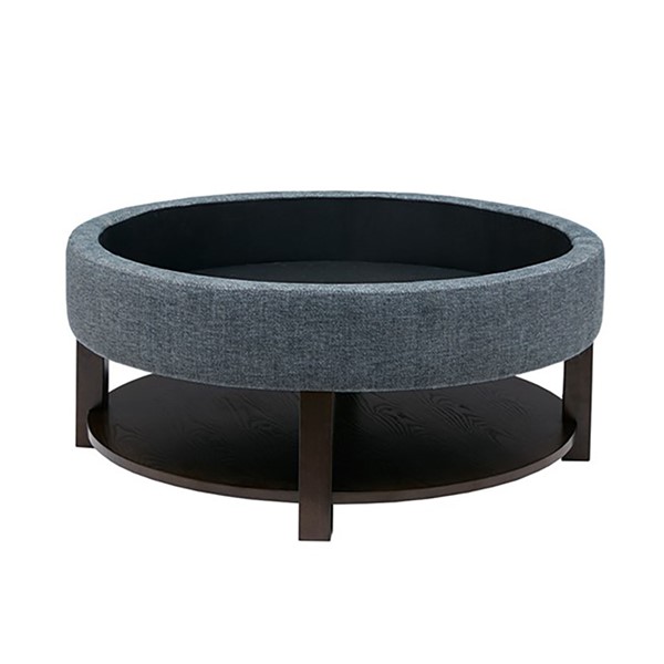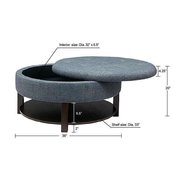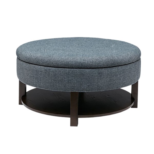 There is no need to sacrifice style for storage with this round storage ottoman. Featuring a tufted top that lifts to reveal ample interior storage space, this round ottoman centralizes the clutter and becomes a stylish addition to your living room. There is also an additional veneer shelf to store magazines and newspapers. Leg assembly is required.