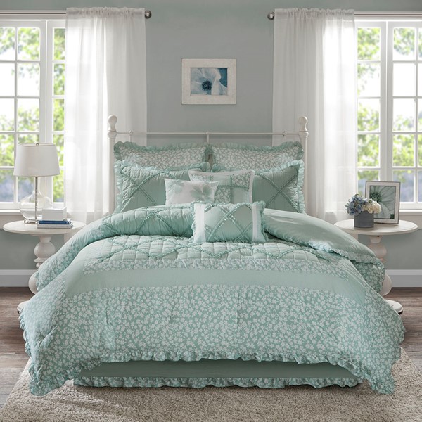 For a cottage chic look in your space, the Madison Park Mindy Comforter provides color and style. The dusty seafoam center has quilting and ruffle details while the outer border features a floral print in white and finishes off the edge with ruffles. Two euro shams and three decorative pillows use coordinating colors and fabric manipulation techniques to pull this whole look together. Items in the set may come in a rolled or compressed packaging, which will need to be fluffed up or steam ironed before use to remove wrinkles.