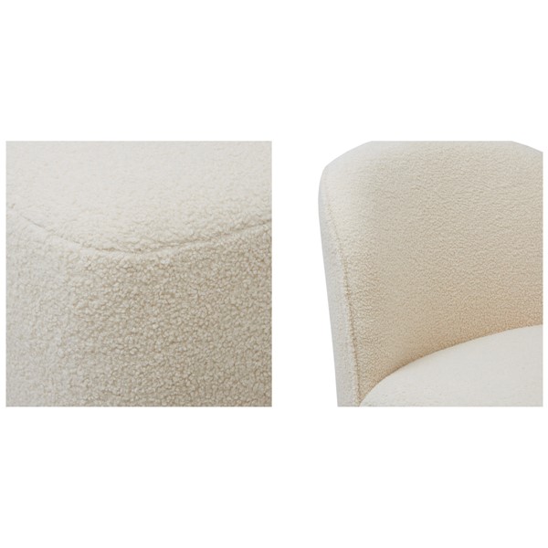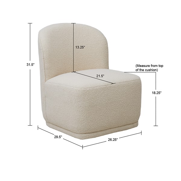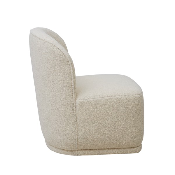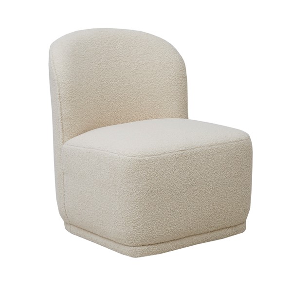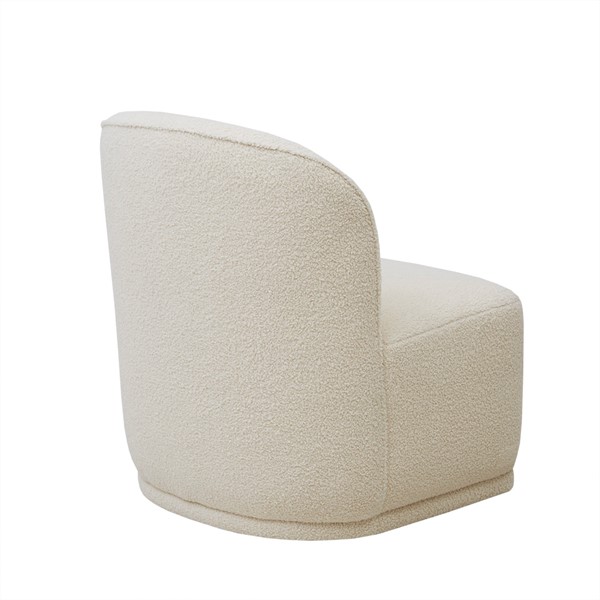 The Madison Park Irene Armless Swivel Chair offers a modern sophisticated update to your living room. Upholstered in an ivory faux boucle fabric, this swivel chair flaunts a rounded design and curved back to create a chic minimalistic profile. The hidden swivel base allows the chair to fully rotate 360 degrees. Perfect for small spaces, this swivel chair brings an inviting look and cozy comfort to your home decor. Ready right out of the box! No assembly is required.