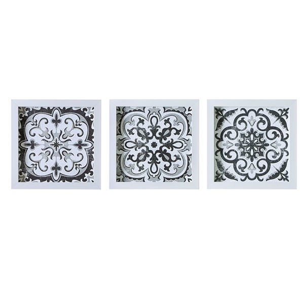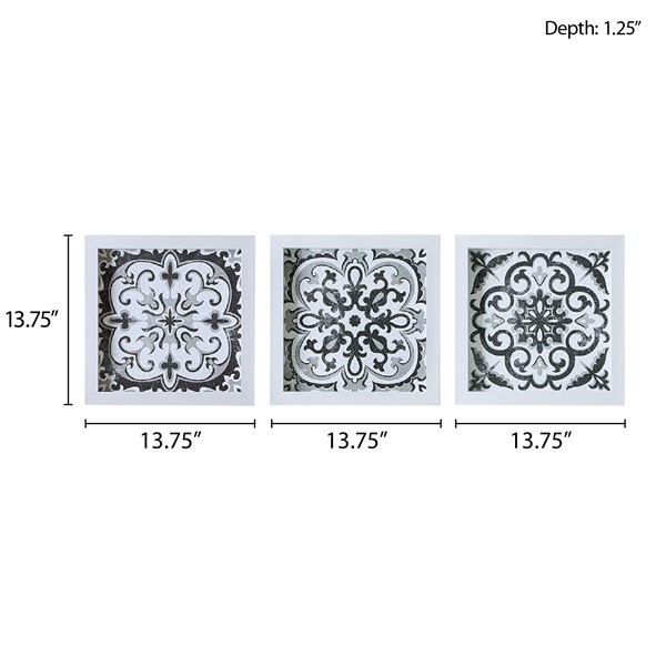 The Madison Park Montage Distressed Black and White Medallion Tile 3-piece Wall Decor Set by Artist Z Studio, brings a bold and stylish touch to your home decor. Each deco box features an intricate medallion design in black and white hues, for a striking and contrasting update. A gel coat finish is added to the distressed paper ground for a rich texture and light glossy finish, while the white frame provides the finishing touch for a neat shadowbox effect. A Sawtooth is featured on reverse of each piece making this set easy to hang; simply assemble the pieces together horizontally or vertically to fit any space or hang pieces separately for a more stylized approach. Spot clean only with each piece measuring 13.75×13.75", this 3 piece set is perfect to add some style and pattern to any entry way, kitchen space, or bathroom.