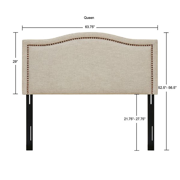 Elevate your bed with the refined look of the Madison Park Nadine Upholstered Panel Headboard. This headboard is upholstered with copper nail heads around the edge to create a chic transitional design. The adjustable black metal legs make it easy to find the correct height to fit your bed frame, while the plywood frame construction provides added stability and durability. Showcasing elegant and clean lines, this upholstered headboard offers a stylish versatility to complement any bedroom decor. Assembly required and tools are included. Hardware (pack B) included to attach headboard to standard bed frame.