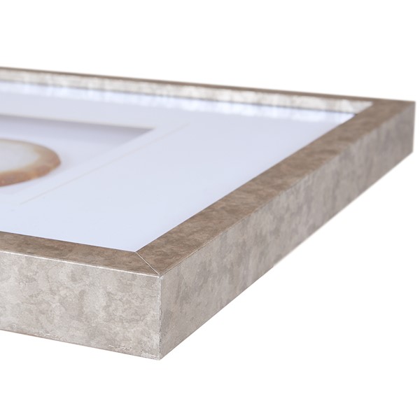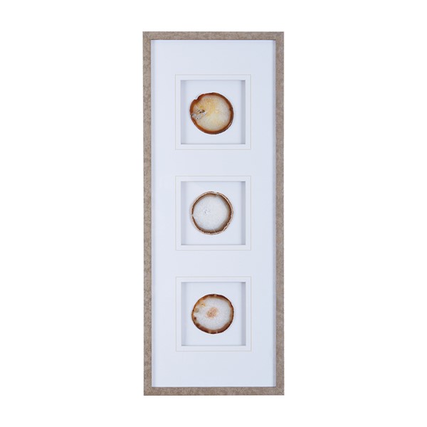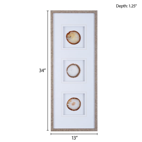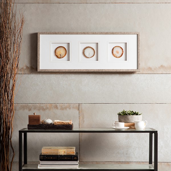 Elevate your space with the Madison Park Natural Agate Trio by Artist Studio 5. Featuring 100% real 4" agate stones in rich natural hues, each geode stone is cut into a one of a kind piece. The stones are settled on a single matte white ground and placed under glass for a gallery look and feel, while a unique warm frame provides the finishing touch. With 3 D-rings on the reverse; easily display this 34×13" singe wall art vertically or horizontally for a natural and modern update to fit space or decor. Due to the natural properties of each agate stone, colors and shapes of agate may vary from image. Spot clean only.