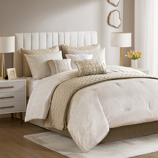 This 10-piece set includes a velvet jacquard comforter paired with a coordinating quilt, providing visual depth and versatile layering for year-round use. Matching shams, quilted shams, decorative pillows, and a tailored bed skirt complete the set, making it easy to achieve a finished bed without additional styling.