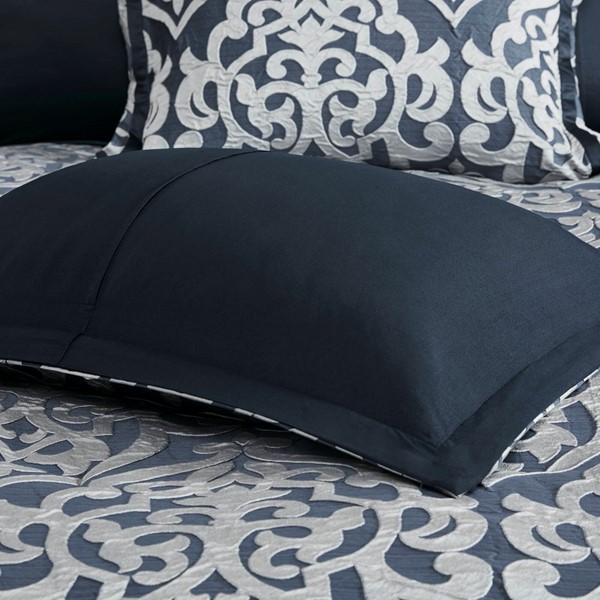 Add a touch of class to your bedroom with the Madison Park Odette 8 Piece Jacquard Comforter Set. The luxurious textured jacquard comforter and shams flaunt a gorgeous damask medallion design with silver striations on the satin ground that add dimension to the lavish look. A solid navy reverse and stunning Euro shams complement the top of the bed to complete the ensemble. Also included are two decorative pillows that feature embroidery and cording details, while a solid navy bed skirt provides a clean and elegant finish. Overfilled for superior warmth and comfort, this jacquard comforter set offers a strikingly luxurious update to your decor. Items in the set may come in a rolled or compressed packaging, which will need to be fluffed up or steam ironed before use to remove wrinkles.