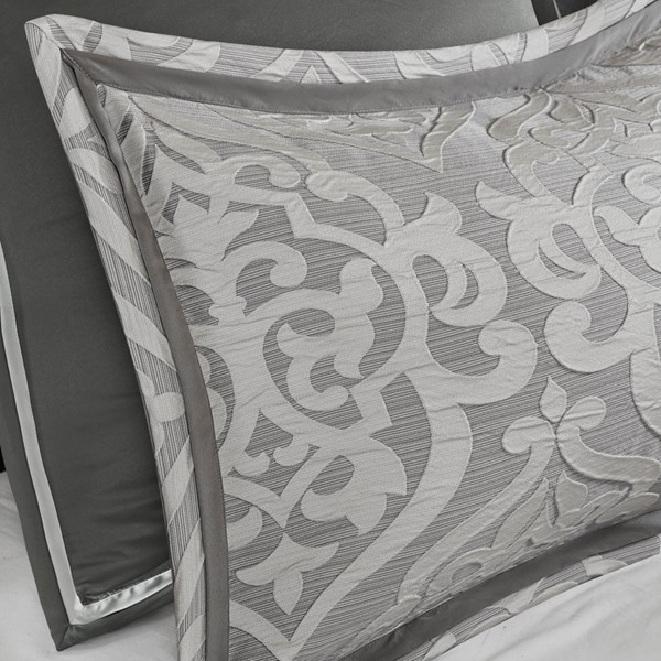 Add a touch of class to your bedroom with the Madison Park Odette 8 Piece Jacquard Comforter Set. The luxurious textured jacquard comforter and shams flaunt a gorgeous damask medallion design with silver striations on the satin ground that add dimension to the lavish look. A solid grey reverse and stunning Euro shams complement the top of the bed to complete the ensemble. Also included are two decorative pillows that feature embroidery and cording details, while a solid silver bed skirt provides a clean and elegant finish. Overfilled for superior warmth and comfort, this jacquard comforter set offers a strikingly luxurious update to your decor. Items in the set may come in a rolled or compressed packaging, which will need to be fluffed up or steam ironed before use to remove wrinkles.