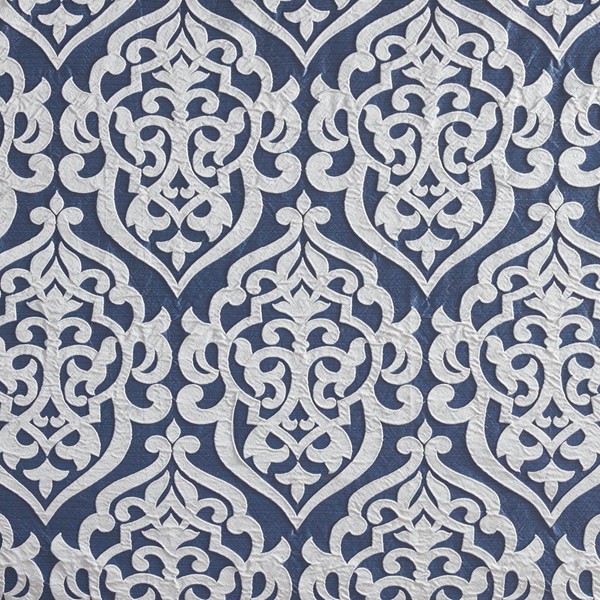 Add a touch of class to your bathroom with our Madison Park Odette Jacquard Shower Curtain. This luxurious textured shower curtain flaunts a gorgeous silver damask medallion design on a stria navy jacquard ground that adds rich texture and dimension to the lavish look. Measuring 72×72″, each shower curtain is finished with 12 button holes on top making it easy to assemble hooks and hang onto rod (hooks and rod not included). To better preserve this beautiful shower curtain, a water repellant liner is highly recommended and can be purchased separately (liner not included). Machine washable for easy care; complete the collection with coordinate matching bedding, alas available and sold separately.