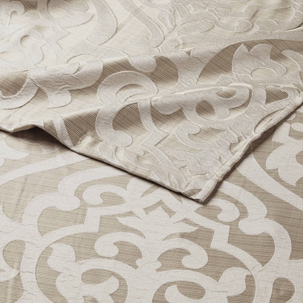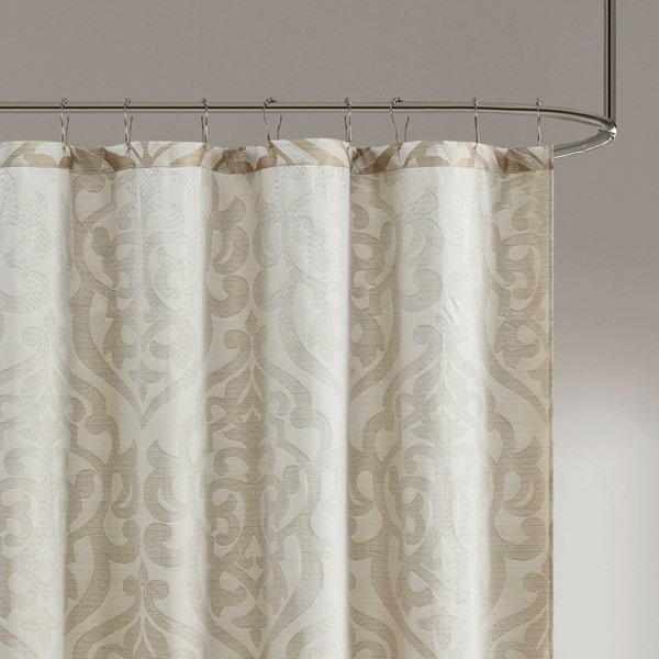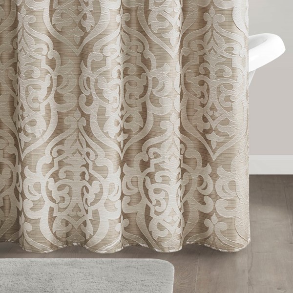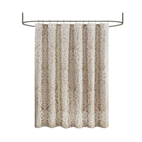 Add a touch of class to your bathroom with our Madison Park Odette Jacquard Shower Curtain. This luxurious textured shower curtain flaunts a gorgeous ivory damask medallion design on a stria tan jacquard ground that adds rich texture and dimension to the lavish look. Measuring 72×72″, each shower curtain is finished with 12 button holes on top making it easy to assemble hooks and hang onto rod (hooks and rod not included). To better preserve this beautiful shower curtain, a water repellant liner is highly recommended and can be purchased separately (liner not included). Machine washable for easy care; complete the collection with coordinate matching bedding, alas available and sold separately.