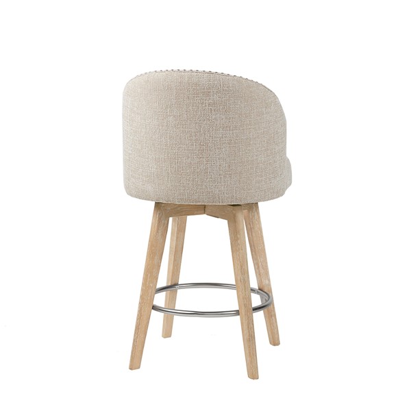 Add an exquisite transitional appeal to your dining area with the Madison Park Onyx Swivel Counter Stool. Designed in a barrel style, this counter stool is upholstered in a rich cream fabric accentuated by a button tufted back and a silver nail head trim, for an elegant touch. The straight, solid wood legs feature a reclaimed wheat wood finish that complements the upholstery, creating a beautiful coordinated look. A swivel base allows the counter stool to rotate 360 degrees, while the silver metal footrest provides sturdy support. With an exceptionally comfortable attached cushion, this swivel counter stool makes a stunning addition to any dining room. Assembly is required. Max weight capacity: 300 lbs.