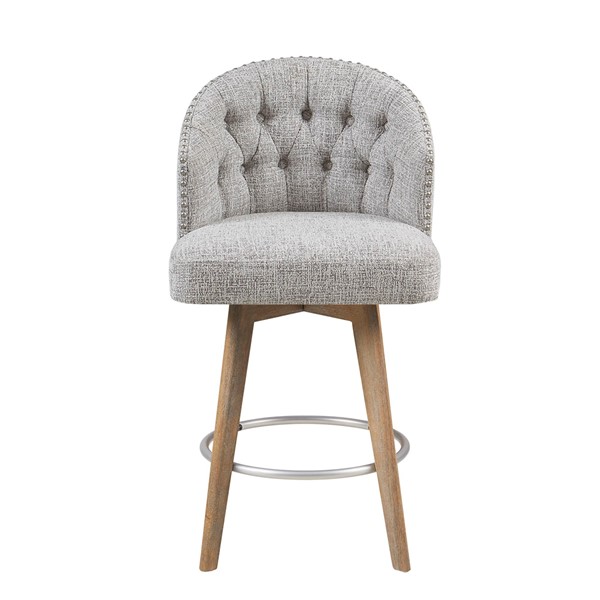 Add an exquisite transitional appeal to your dining area with the Madison Park Onyx Swivel Counter Stool. Designed in a barrel style, this counter stool is upholstered and accentuated by a button tufted back and a silver nail head trim, for an elegant touch. The straight, solid wood legs feature a reclaimed wheat wood finish that complements the upholstery, creating a beautiful coordinated look. A swivel base allows the counter stool to rotate 360 degrees, while the silver metal footrest provides sturdy support. With an exceptionally comfortable attached cushion, this swivel counter stool makes a stunning addition to any dining room. Assembly is required. Max weight capacity: 300 lbs.