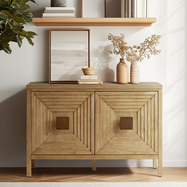The Madison Park Paige Storage Cabinet offers a perfect blend of modern and transitional style with a striking geometric layered pattern on the doors. Two unique doors with contrasting dark coffee-finished square wooden knobs open to spacious storage with two adjustable shelves. A durable frame crafted from engineered wood and solid wood legs, plus a center support leg, ensures stability. At 47.5″ long, it’s ideal for living room, entryway, dining room, home office and more. The elevated base allows for robotic vacuum cleaning. Assembly required. Not for bedroom use. Upgrade your space with the Paige cabinet today!