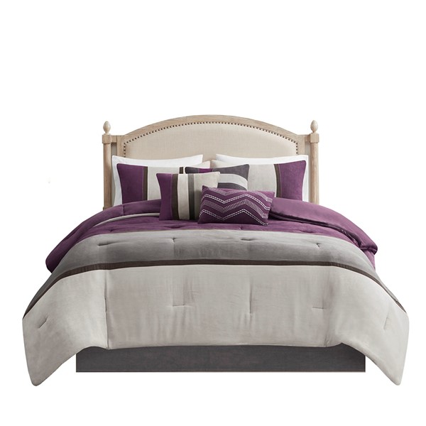 The Madison Park 7 Piece Palisades Comforter Set offers you a casual alternative in fashion bedding. The reverse of the comforter is solid purple. The soft microsuede in heather grey, purple and charcoal grey is pieced together to create this beautiful bed. The decorative pillows are embroidered and pieced to add a decorative element to this simple, yet beautiful bedding collection. With hypoallergenic filling in the comforter and pillows, this stylish comforter set easily refreshes your bedroom decor and is machine washable for easy care. Items in the set may come in a rolled or compressed packaging, which will need to be fluffed up or steam ironed before use to remove wrinkles.