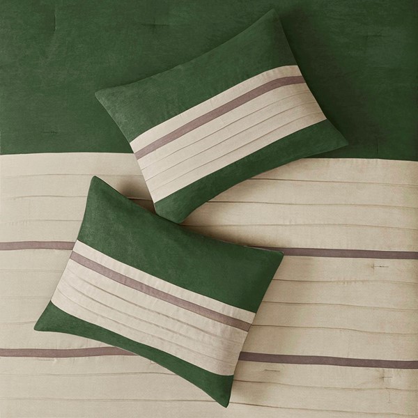 The Madison Park Palmer 7 Piece Comforter Set offers a classic and refined update to your bedroom decor. This transitional style comforter features a pieced microsuede design in rich contrasting green and beige colors to create an incredibly soft look and feel. The 2 matching shams also flaunt a pieced construction to coordinate with the faux suede comforter. A solid beige bed skirt and 3 decorative pillows with a mix of embroidered designs add the perfect finishing touches to complete this lush traditionally-inspired comforter. Machine washable for easy care, items in the set may come in a rolled or compressed packaging, which will need to be fluffed up or steam ironed before use to remove wrinkles.
