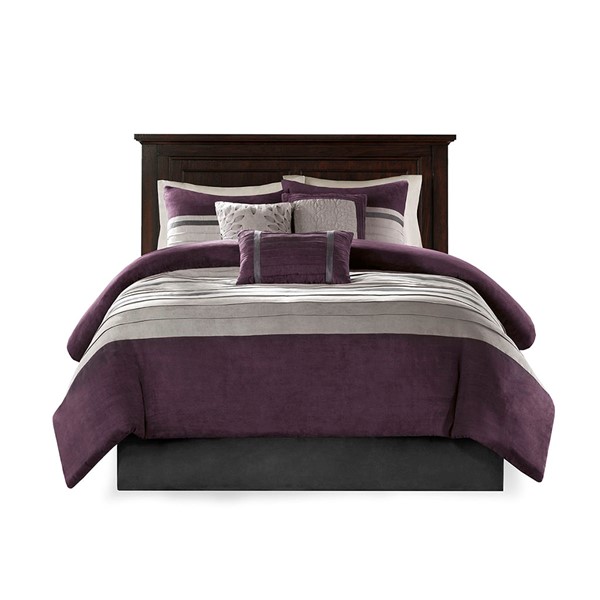The Madison Park Palmer 7 Piece Comforter Set offers a classic and refined update to your bedroom decor. This transitional style comforter features a pieced microsuede design in rich contrasting plum and grey colors to create an incredibly soft look and feel. The 2 matching shams also flaunt a pieced construction to coordinate with the faux suede comforter. A solid grey bed skirt and 3 decorative pillows with a mix of embroidered designs add the perfect finishing touches to complete this lush traditionally-inspired comforter. Machine washable for easy care, items in the set may come in a rolled or compressed packaging, which will need to be fluffed up or steam ironed before use to remove wrinkles.