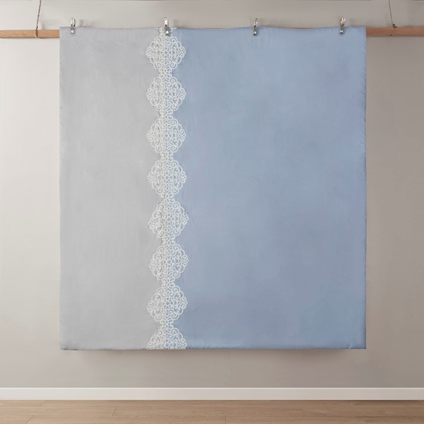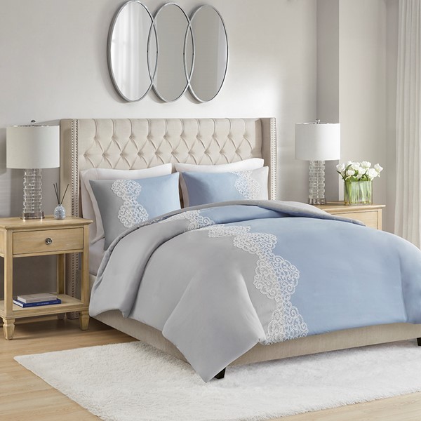 Elegance and glam are brought together in the beautiful transitional design of this luxury duvet cover set. Soft gray and blue colors are accented by coordinating white floral embroidery to create an understated and charming look. The solid gray reverse complements the top of the bed and gracefully tailored shams match the delicate style of the duvet. Elevate your bedroom with the refreshing style and lush comfort of this embroidered duvet cover set.