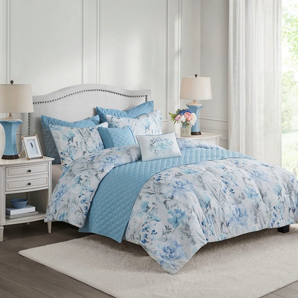 Transform your bedroom with the Madison Park Pema 8 Piece Printed Seersucker Comforter and Quilt Set Collection. This seersucker comforter and 2 shams feature an allover blue floral print, for a botanical look with a soft textured feel. The coordinating solid blue quilt and 2 matching shams showcase a channel stitch quilting pattern that adds dimension to the top of your bed. Also included are 1 square and 1 oblong decorative pillow both with embroidered details to provide sophisticated finishing touches. Offering a super value of 2 unique bedding sets, this seersucker bedding collection gives your bedroom a charming cottage-inspired update. This luxurious bedding collection also has an antimicrobial odor protection treatment that provides built-in freshness protection, inhibits growth of odor causing bacteria, and keeps the fabric newer, longer.