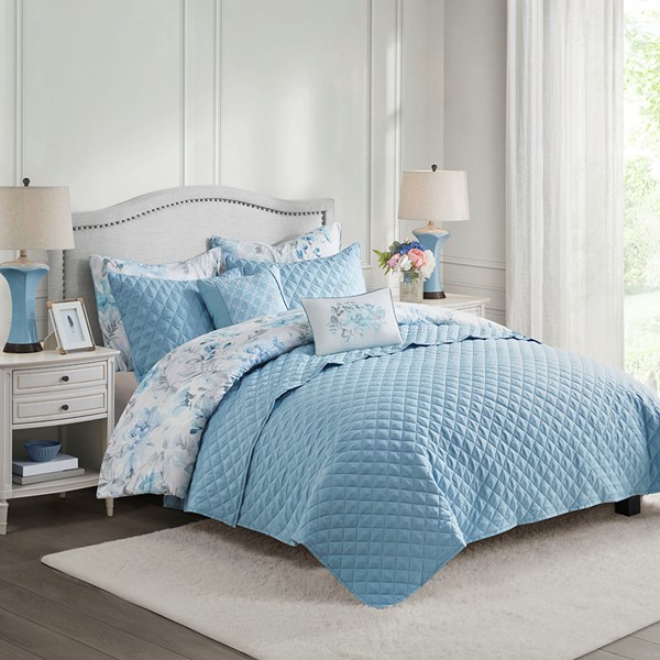 Transform your bedroom with the Madison Park Pema 8 Piece Printed Seersucker Comforter and Quilt Set Collection. This seersucker comforter and 2 shams feature an allover blue floral print, for a botanical look with a soft textured feel. The coordinating solid blue quilt and 2 matching shams showcase a channel stitch quilting pattern that adds dimension to the top of your bed. Also included are 1 square and 1 oblong decorative pillow both with embroidered details to provide sophisticated finishing touches. Offering a super value of 2 unique bedding sets, this seersucker bedding collection gives your bedroom a charming cottage-inspired update. This luxurious bedding collection also has an antimicrobial odor protection treatment that provides built-in freshness protection, inhibits growth of odor causing bacteria, and keeps the fabric newer, longer.