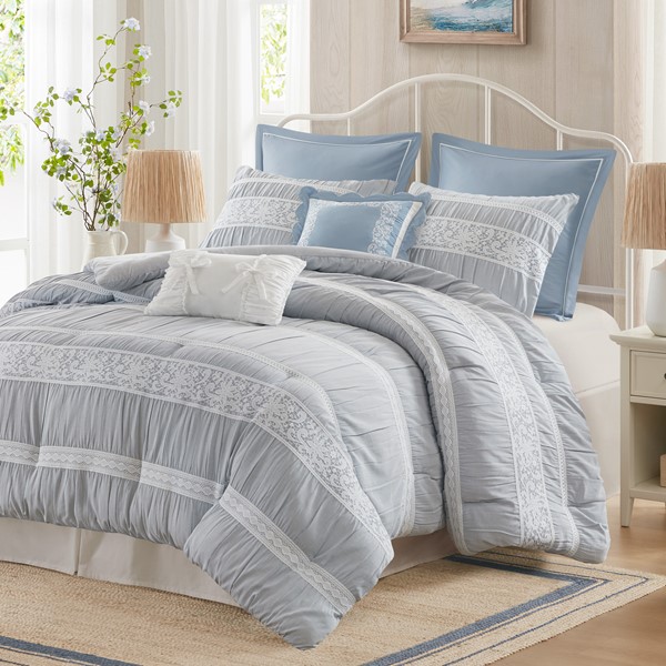 The comforter features a yarn-dye chambray fabric accented with lace jacquard detailing, offering subtle texture and vintage-inspired charm. Delicate lace accents and gentle gathers enhance the shabby chic aesthetic while maintaining an airy, relaxed feel suited for everyday living.
