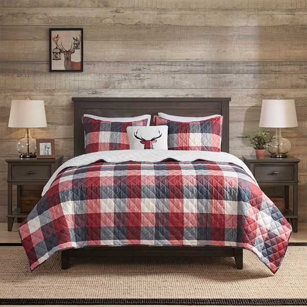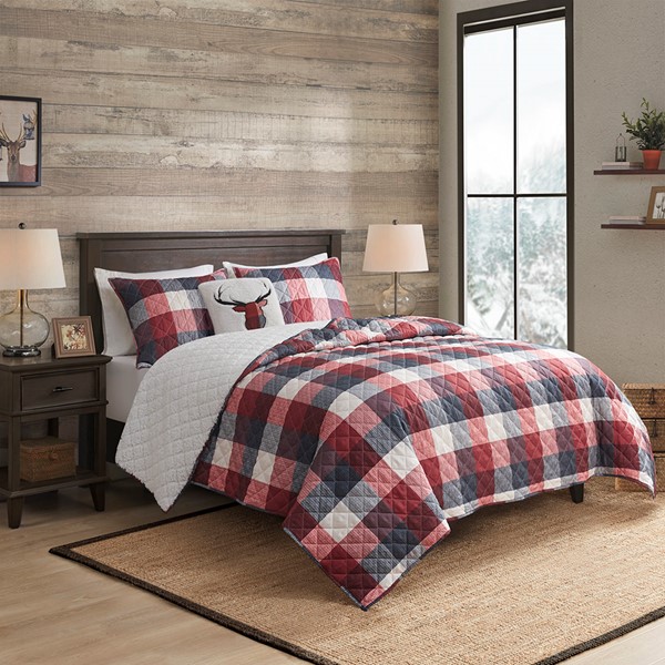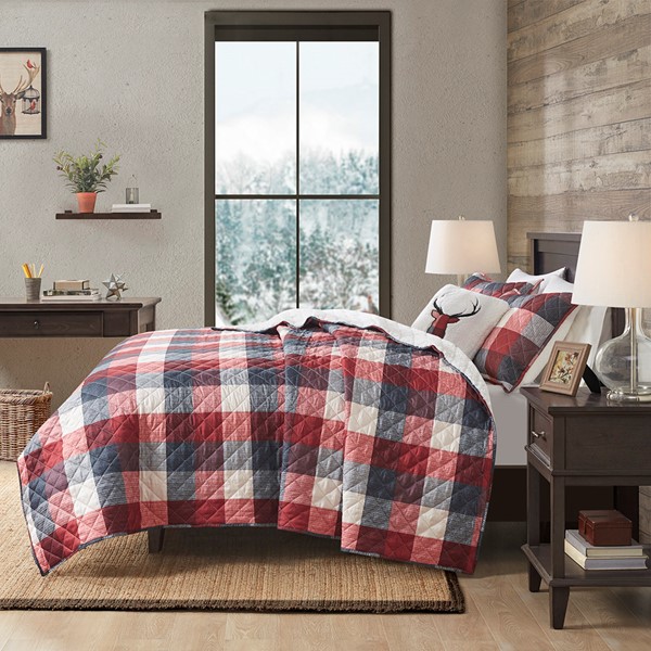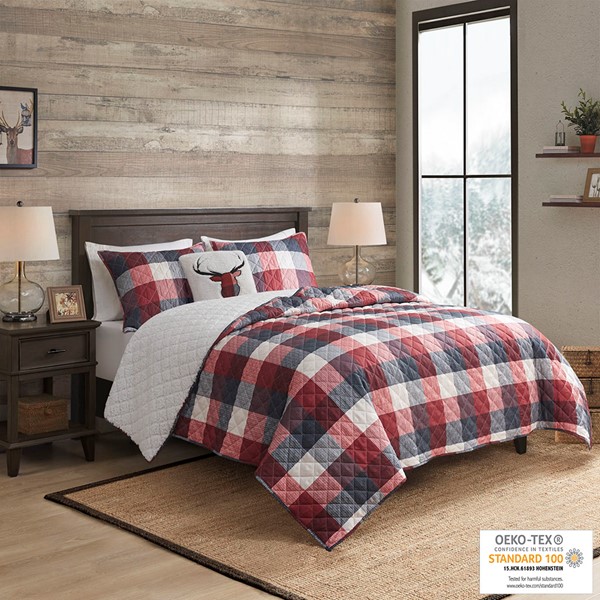 Sleep in warm, cozy comfort with the Madison Park Pines Hill 4 Piece Printed Herringbone to Sherpa Reversible Coverlet Set. This cabin style coverlet features a red buffalo plaid pattern with a cozy sherpa reverse, for added warmth and comfort. Channel quilting along the coverlet adds a delicate touch to the country look. The 2 matching shams pair handsomely with the coverlet, while a square decorative pillow with a deer applique adds the finishing touch to this lodge style coverlet set. Machine washable for easy care, this reversible farmhouse coverlet set is OEKO-TEX certified, meaning it does not contain any harmful substances or chemicals to ensure quality comfort and wellness.