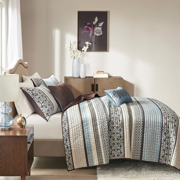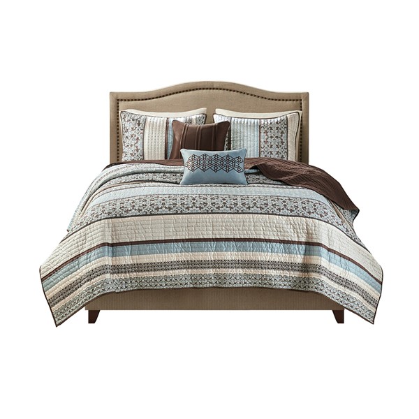 To add a touch of richness to your current decor, the Princeton 5 Piece Reversible Jacquard Quilt Set can update your room in seconds. Made from polyester jacquard, the quilt and shams share leaf, striping and medallion motifs that are accentuated by channel stitching on a chocolate brown base. Pops of blue are also used throughout this collection adding a lavish feeling to your decor. Two decorative pillows feature pleating and embroidery details that correspond back to the quilt to bring this entire look together. Items in the set may come in a rolled or compressed packaging, which will need to be fluffed up or steam ironed before use to remove wrinkles.