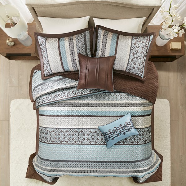 Add a touch of richness to your home decor with the Madison Park Princeton 5 Piece jacquard bedspread set. Princeton creates character with intricate geometric and damask prints in a mix of grey, ivory, and soft blue tones with solid chocolate brown border. The two matching shams repeat the design of the bedspread, and 2 decorative pillows with pleating and embroidery details pull the look together. Made from polyester jacquard and a brushed fabric reverse this comforter is soft to the touch and is machine washable for easy care.
