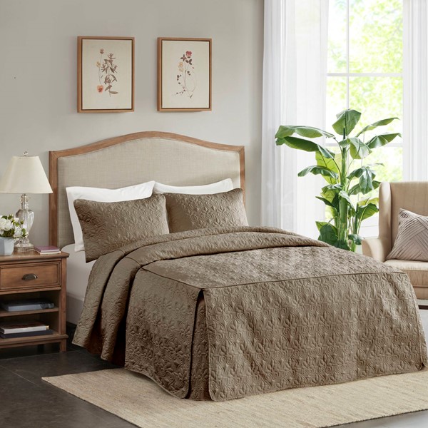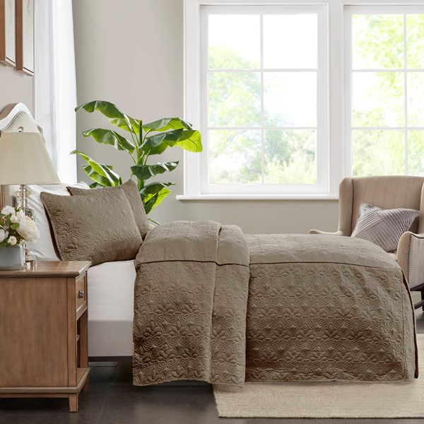 The Madison Park Quebec 3 Piece Quilted Bedspread Set offers a charming cottage-inspired update to your bedroom. The open split-corner bedspread and shams flaunt a classic stitch pattern that creates a rich depth and texture on the face of the bedding set. All-over quilted box sewing keeps the filling secure, while the 24-inch drop sides create a clean draped look with pleated corners. It is available in four different colors including a soft cream, dark grey, rich taupe, and vibrant navy. This fitted bedspread also has an antimicrobial treatment that provides built-in freshness protection, reducing the growth of odor causing bacteria to keep fabric lasting longer.