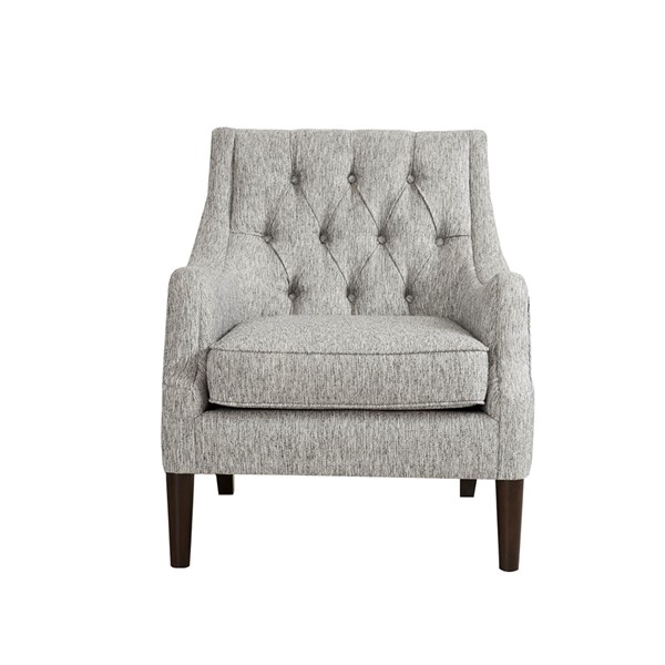 Elevate your living room with the vintage-inspired style of the Madison Park Qwen Button Tufted Accent Chair. This accent chair is upholstered in a soft, rich fabric that features a button tufted back to create an elegant transitional look. The solid wood legs flaunt a morrocco finish that complements the upholstery. With its soft removable seat cushion, this upholstered accent chair adds the perfect combination of comfort and style to your home decor. Leg assembly is required.