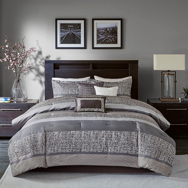 Give your bedroom a new luxurious look with the Madison Park Rhapsody 7 Piece Jacquard Comforter Set. This jacquard comforter features a grey and taupe stripe design of several different motifs on the face with a solid grey reverse, for a chic transitional look. The 2 matching shams complement the design of the comforter to complete this glam comforter set. Also included is a solid brown bed skirt and 3 decorative pillows with embroidery and pleated details provide the finishing touches. Machine washable for easy care, this jacquard comforter set brings a sophisticated update to your bedroom decor. Items in the set may come in a rolled or compressed packaging, which will need to be fluffed up or steam ironed before use to remove wrinkles.