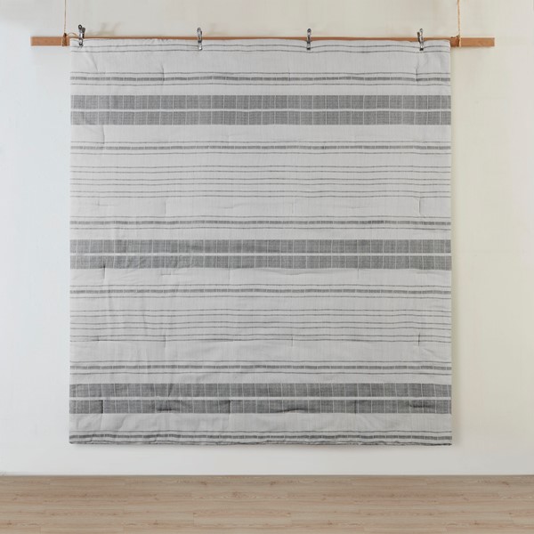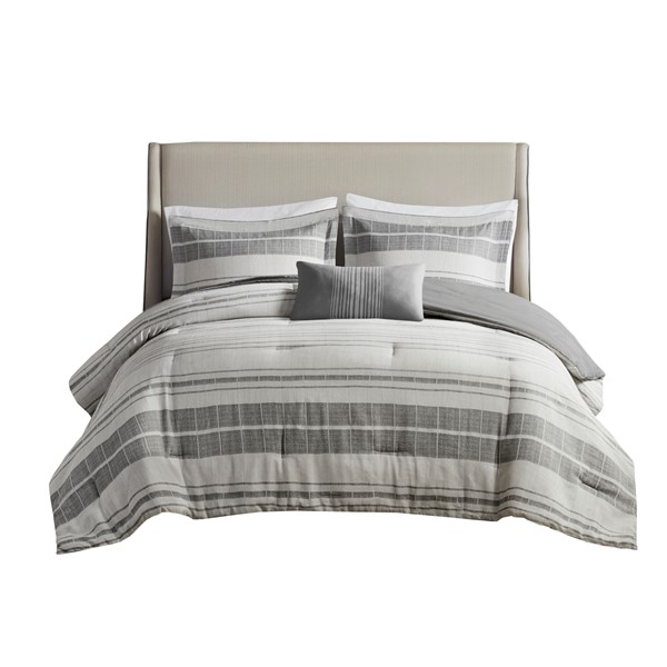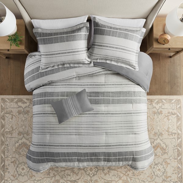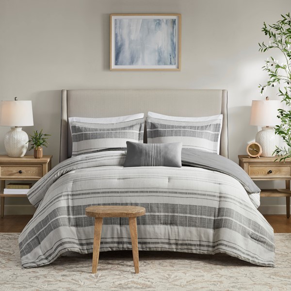 This modern farmhouse bedding set features printed black stripes on a grey and white background made of a cotton/poly slub fabric for a linen-like look. The cotton/poly blend offers softness, good air flow, added durability, and wrinkle resistance. Coordinating shams pair handsomely with the comforter, while the solid embroidered decorative pillow adds a charming finishing touch to the bed set. Hypoallergenic polyester filling in the comforter and pillows provide exceptional warmth and comfort. Machine washable for easy care, this soft woven comforter is also OEKO-TEX certified.