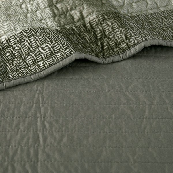 Give your guest bedroom that classic cabin look with this reversible daybed cover featuring a herringbone style, buffalo plaid print that flips to a solid reverse for a casual rustic look. The 3 reversible shams allow you to match with either side of the daybed cover, while a square decorative pillow adds a complementary touch to the top of the bed. A solid coordinating bed skirt completes the lodge style bedding. The bed set is available the different color combinations: bold greys with beige, earthy natural tones with greys, and classic red with black. With a quilted cover and pre-washed cotton-rich filling, this reversible daybed cover set offers a soft and comfortable cabin allure for your guest room. The daybed cover fits a Twin size mattress.