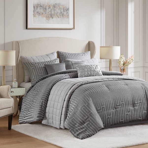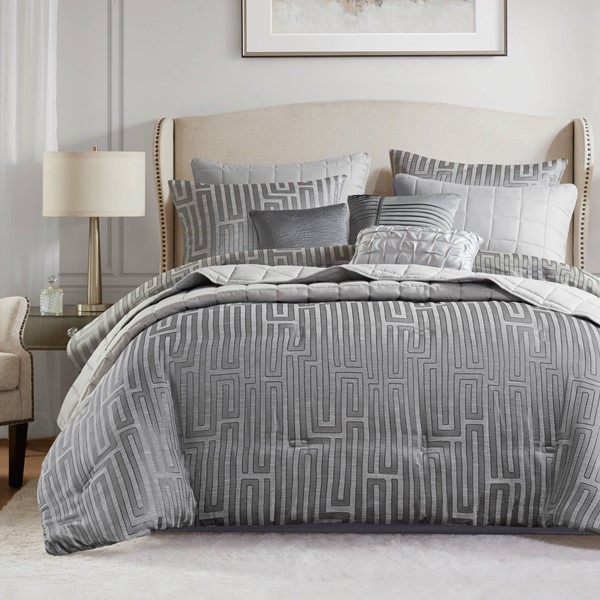 Experience the perfect blend of comfort and luxury with this 10-piece ensemble, featuring a lustrous geometric jacquard comforter paired with a cozy quilt. Complete with matching shams, decor pillows, and a tailored bed skirt, this set offers timeless elegance. The Greek fret jacquard design, woven with metallic thread detailing, adds an elegant shine, while premium polyester ensures softness, durability, and comfort. OEKO-TEX STANDARD 100 Certified and free from harmful substances, it provides all-season comfort with a lightweight, fluffy feel and a versatile quilt for year-round use. Designed for effortless care, the set is machine washable, with spot-cleaning recommended for the decorative pillows. This set transforms your bedroom into a haven of refined elegance and luxury.