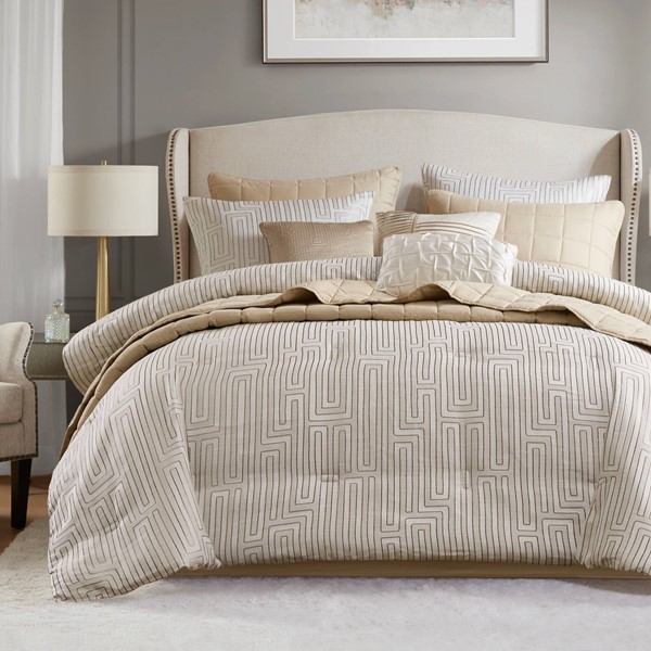 Experience the perfect blend of comfort and luxury with this 10-piece ensemble, featuring a lustrous geometric jacquard comforter paired with a cozy quilt. Complete with matching shams, decor pillows, and a tailored bed skirt, this set offers timeless elegance. The Greek fret jacquard design, woven with metallic thread detailing, adds an elegant shine, while premium polyester ensures softness, durability, and comfort. OEKO-TEX STANDARD 100 Certified and free from harmful substances, it provides all-season comfort with a lightweight, fluffy feel and a versatile quilt for year-round use. Designed for effortless care, the set is machine washable, with spot-cleaning recommended for the decorative pillows. This set transforms your bedroom into a haven of refined elegance and luxury.