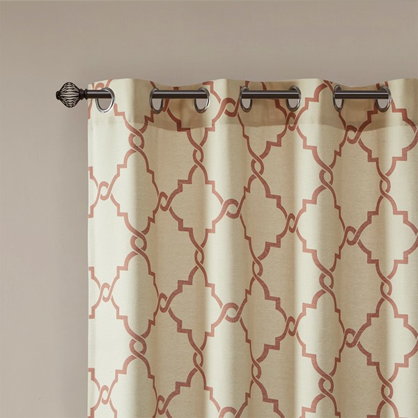 The Madison Park Saratoga Fret Print Panel is the perfect addition for a casual and stylish update to your home decor. This window panel features a trendy spice fretwork on a soft beige ground, creating a simple yet modern look. The cotton blend basket weave fabric softly filters the perfect amount of sunlight into your home, while providing texture for natural appeal. Gunmetal grommet top detail makes this panel easy to hang, open, and close throughout the day. Fits up to a 1.25" diameter rod. Pattern position may vary per panel due to random cutting of fabric.
