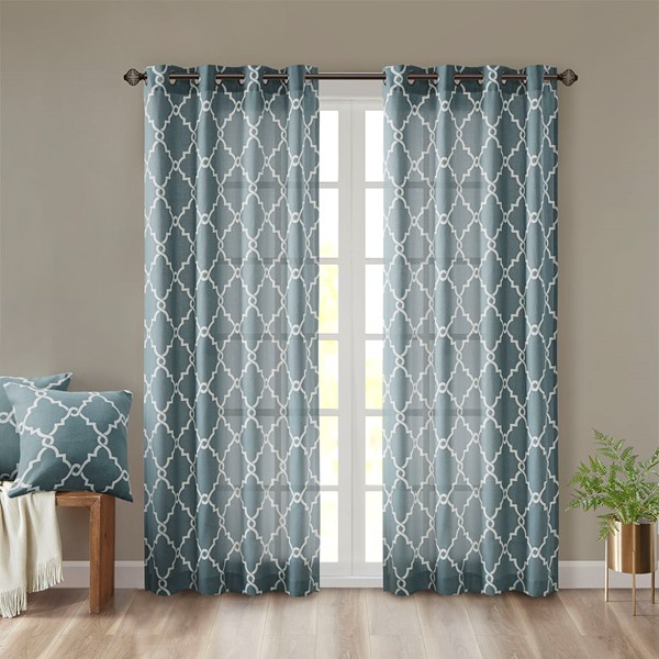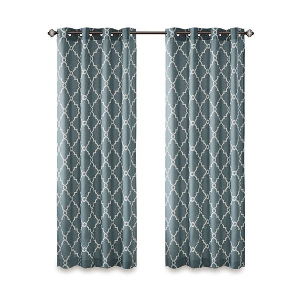 The Madison Park Saratoga Fret Print Panel is the perfect addition for a casual and stylish update to your home decor. This window panel features a trendy light beige fretwork on a soft blue ground, creating a simple yet modern look. The cotton blend basket weave fabric softly filters the perfect amount of sunlight into your home, while providing texture for natural appeal. Gunmetal grommet top detail makes this panel easy to hang, open, and close throughout the day. Fits up to a 1.25" diameter rod. Pattern position may vary per panel due to random cutting of fabric.