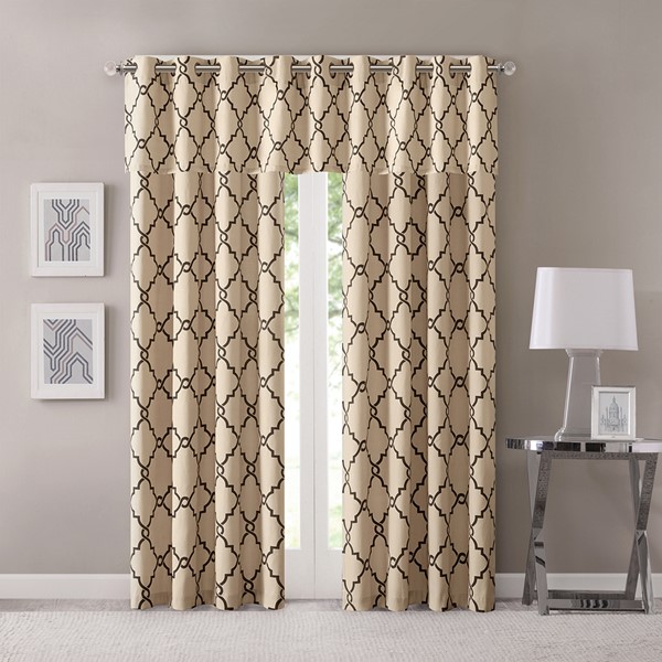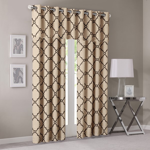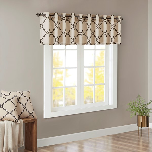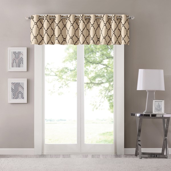 The Madison Park Saratoga Fret Print Window Valance is the perfect addition for a casual and stylish update to your home decor. This valance features a trendy black fretwork on a soft khaki ground, creating a simple yet modern look. The cotton blend basket weave fabric softly filters the perfect amount of sunlight into your home, while providing texture for natural appeal. Gunmetal grommet top detail makes this panel easy to hang, open, and close throughout the day. Fits up to a 1.25" diameter rod. Pattern position may vary per valance due to random cutting of fabric.