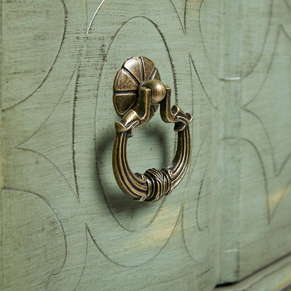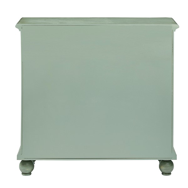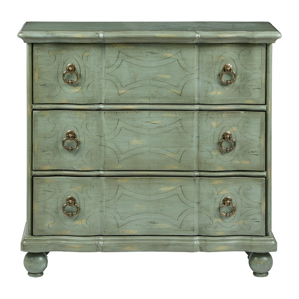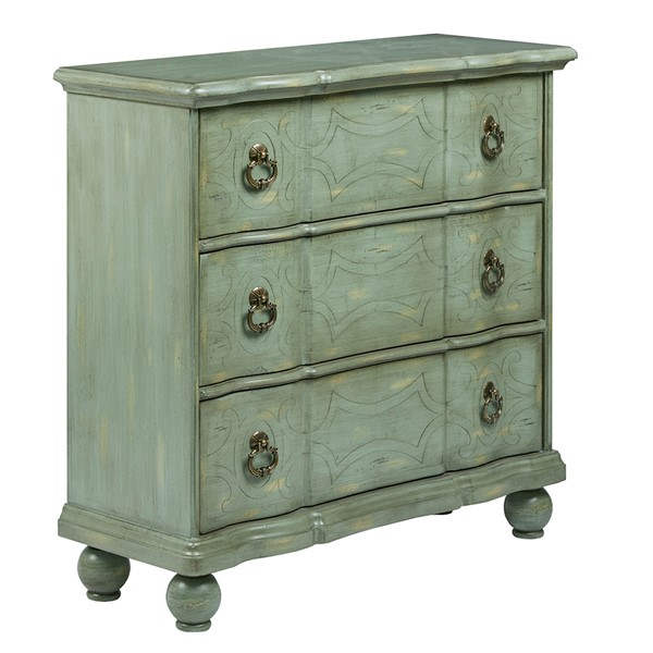 This hand painted accent chest with its blue-green antiqued finish and scrolling work detailing will add flair to any extra space.