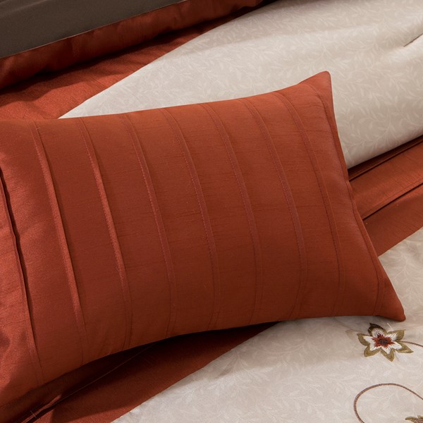 The Serene bedding collection provides an elegant look to your home. The top of the comforter is a mix of rich rust, chocolate brown, and ivory with piecing details while the ivory section has an embroidered floral pattern for a soft divide from these bold colors. Made from polyester dupioni, this fabric will produce a shine and pick up the light on both the comforter and shams. The decorative pillows come in a combination of solids, stripes, and embroidery to pull this whole set together. Items in the set may come in a rolled or compressed packaging, which will need to be fluffed up or steam ironed before use to remove wrinkles.