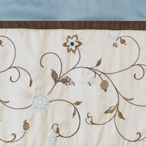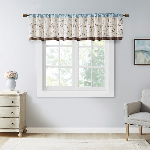 Add simple elegance to any room with the Madison Park Serene Embroidered Valance. This valance features delicate floral embroidery in soft blue and natural hues, offering beautiful contrast for a sophisticated look. The pieced and pleated details provide extra dimension and charm to your home decor, while added lining helps filter the perfect amount of sunlight into your home. Simply hang on 3" rod pocket, fits up to a 1.25" diameter rod.