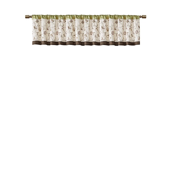 Add simple elegance to any room with the Madison Park Serene Embroidered Valance. This valance features delicate floral embroidery in soft green and natural hues, offering beautiful contrast for a sophisticated look. The pieced and pleated details provide extra dimension and charm to your home decor, while added lining helps filter the perfect amount of sunlight into your home. Simply hang on 3" rod pocket, fits up to a 1.25" diameter rod.