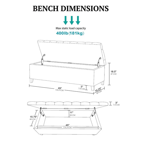 * Large interior storage space of 44.5″W x 15″D x 11″H
